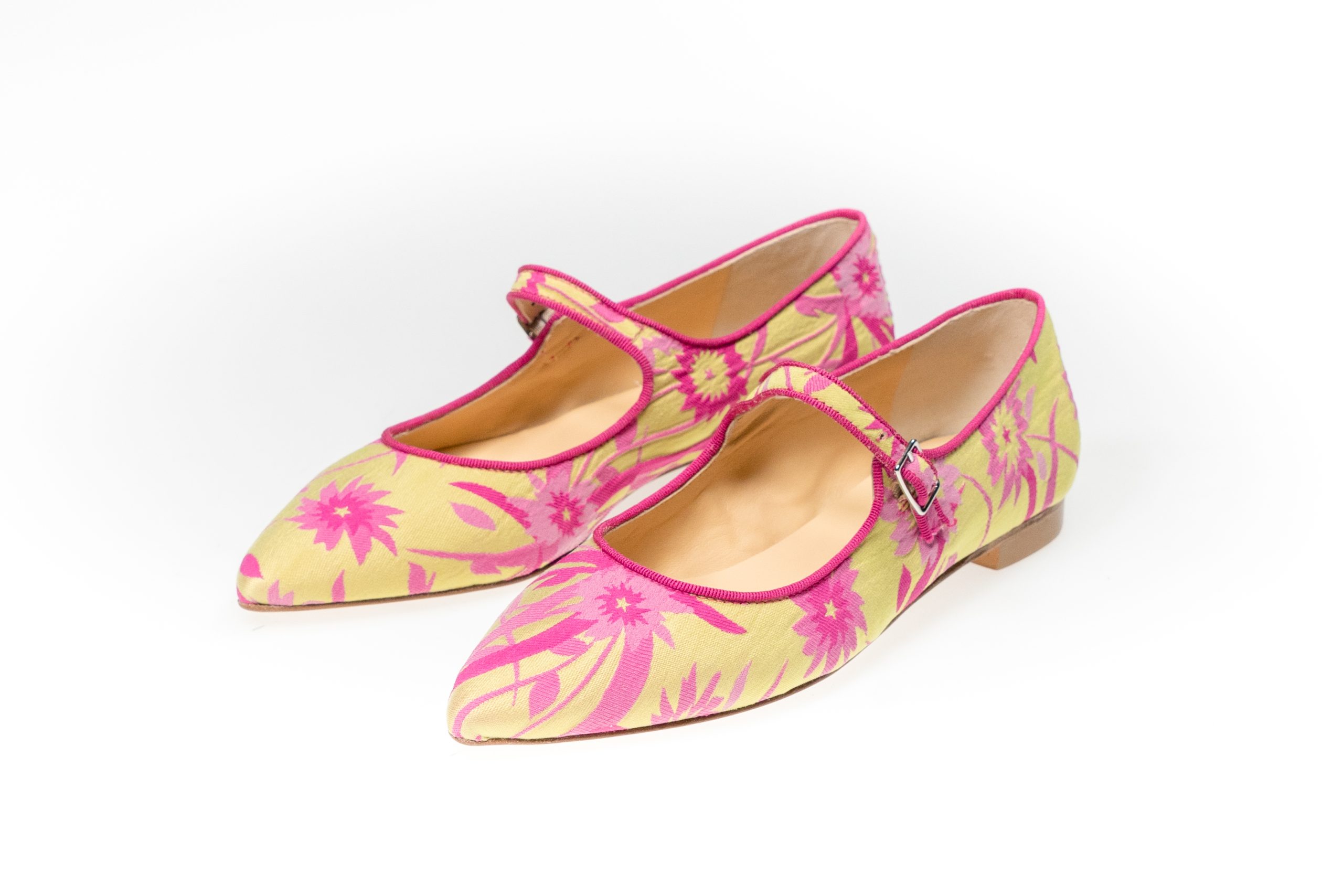 Mary Jane a punta in tessuto, fodera in vitello, suola in cuoio. Produzione artigianale Made in Italy