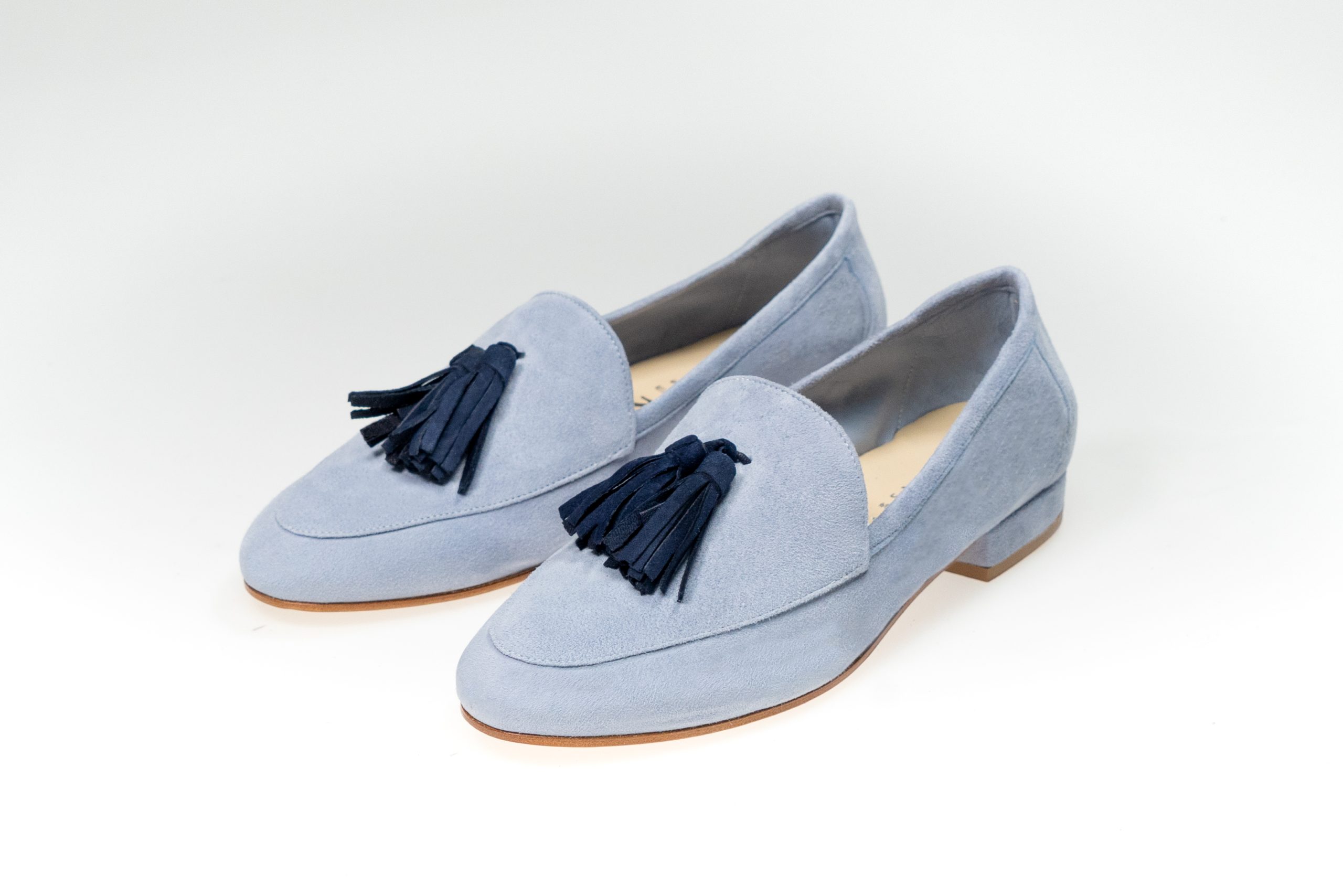Mocassino in camoscio sfoderato con nappina fatta a mano, tacco foderato, punta rotonda, suola in cuoio. Produzione artigianale Made in Italy.