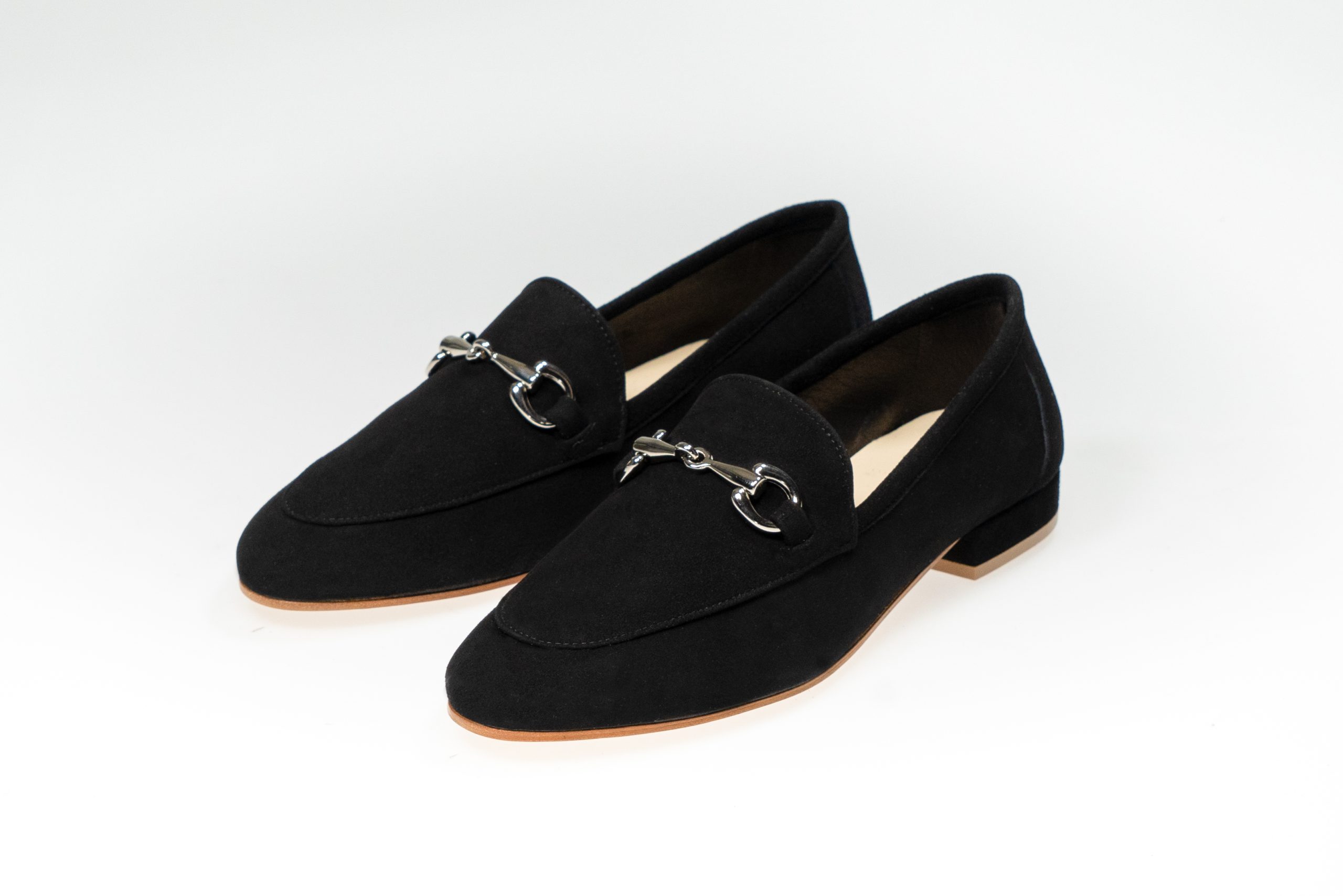 Mocassino in camoscio sfoderato con morsetto metallico, tacco foderato, punta rotonda, suola in cuoio. Produzione artigianale Made in Italy.