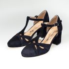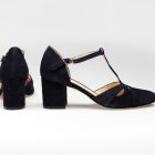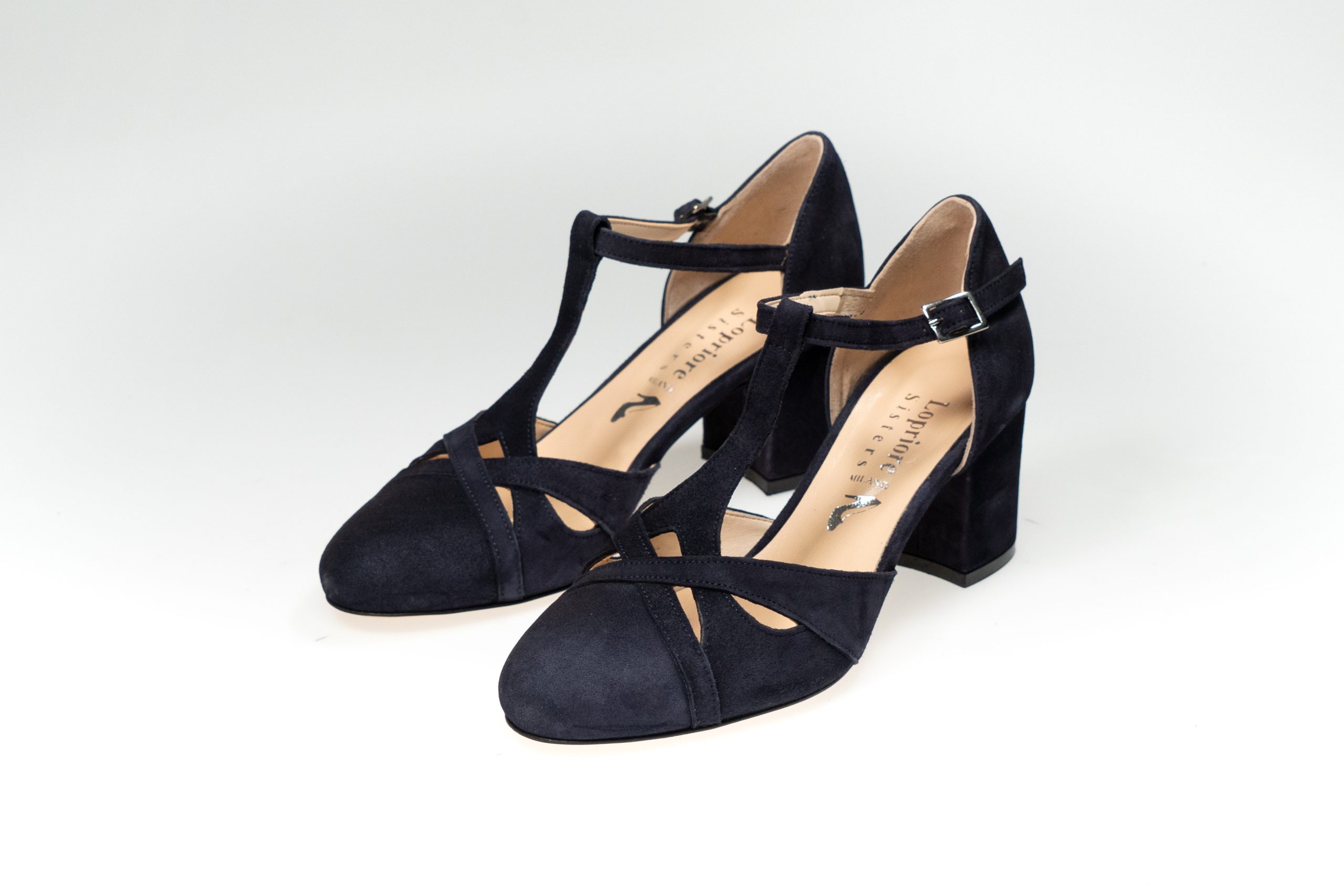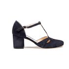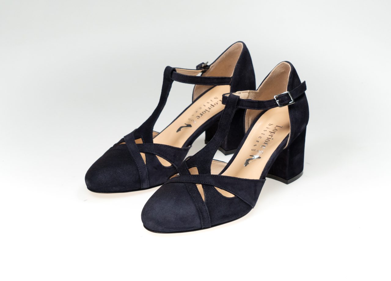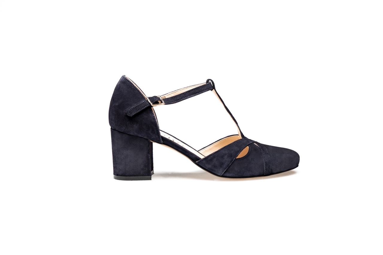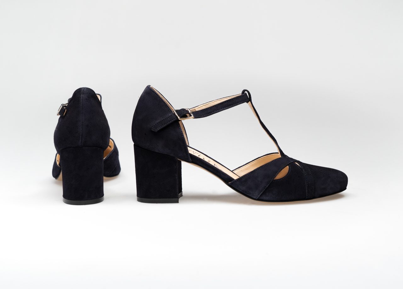 T-lace in camoscio con tacco quadrato, fodera in vitello, suola in cuoio. Produzione artigianale Made in Italy.